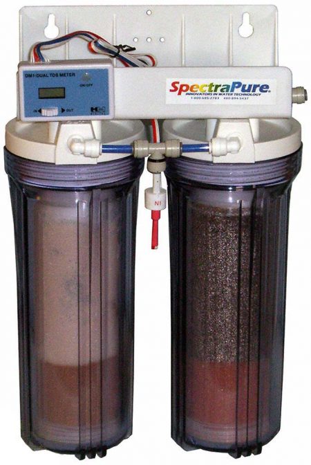 Here’s the gist: We took the Marine Depot 4-Stage Advanced RODI Filter, added a second RO membrane, added 2 additional DI resin containers, added a SpectraPure Auto Shut Off Float Valve Kit, and mounted the unit outside in the shed.