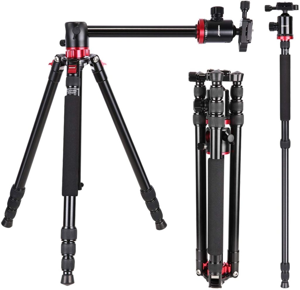 This tripod is the most expensive item on this list, but there is a good reason for that. First off, it’s heavy duty, but light. It’s made of an aluminum alloy, and can stretch up to 75″ (191 cm), which is great for anybody who is tall.