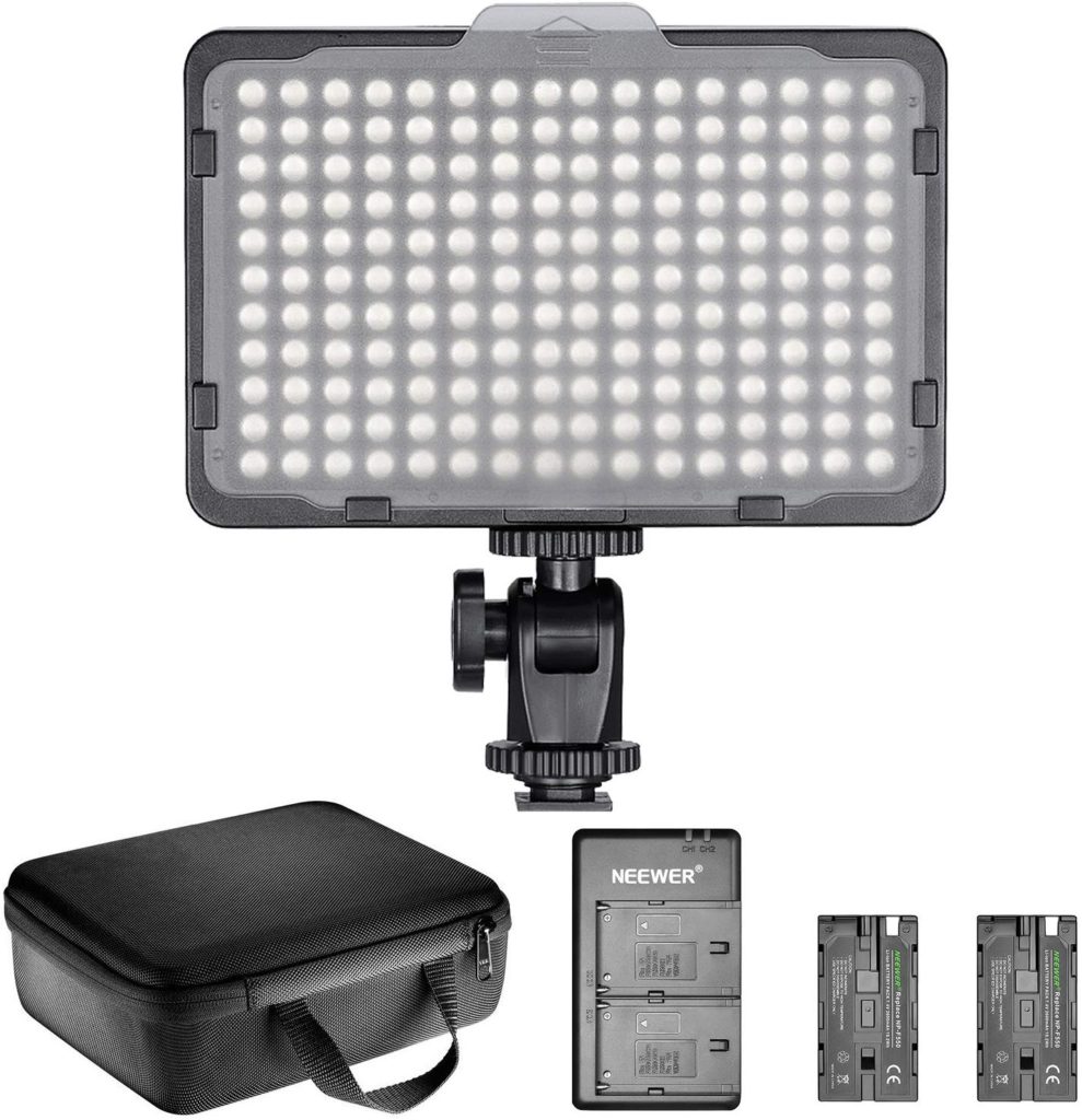 This kit comes with a carrying case, charger, two rechargeable batteries, dimmable LED light, and two diffusers. You can mount this to your camera using the hot shoe, but if you want to put it anywhere else, you’ll need a tripod.