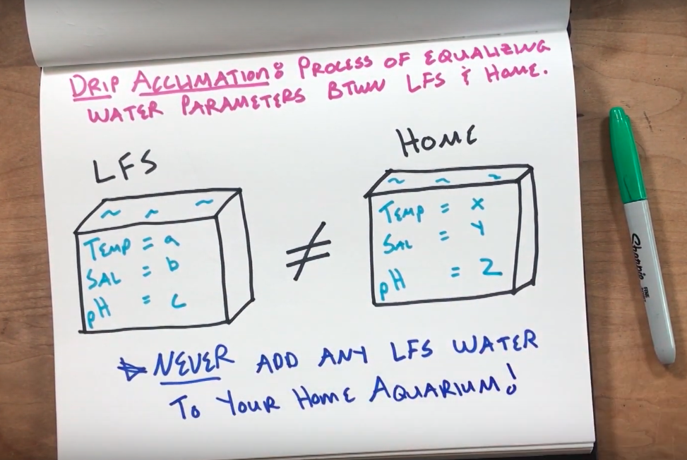 Drip acclimation is the process of slowly equalizing the water parameters from the fish store to your aquarium. Usually done by putting your new livestock in a bucket and starting a siphon with a portion of airline tubing. Then, over the span of 30 minutes, water from your tank is slowly added to the LFS water, equalizing water parameters such as temperature and pH, thus reducing stress in your fish.