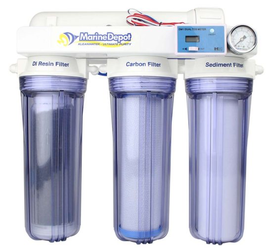 Reverse Osmosis / De-Ionization Filter. RO/DI filters use various stages and types of filtration to achieve 0 TDS water. Water first passes through a sediment filter, then a carbon filter, then the RO membrane, and finally through de-ionization resin. Considered the gold standard for creating clean water for your saltwater aquarium, the various types of media do have to be replaced depending on the amount of water you make and the makeup of your local water supply.